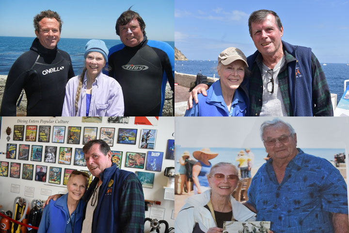 Image caption: Ed Stetson, Zale and the good doctor on a previous visit; Zale and Doc recently; Zale in Jon Council's diving history museum and Zale reuniting with her safety diver Cap Perkins several years ago.