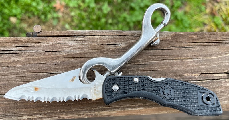 The bolt snap is a new development. After years of pondering where to stow it (such as in a little pocket), it finally dawned on me I could bolt snap it to a D ring on my rig. If I get too concerned about losing it, a zip tie could better secure the blade to bolt snap.
