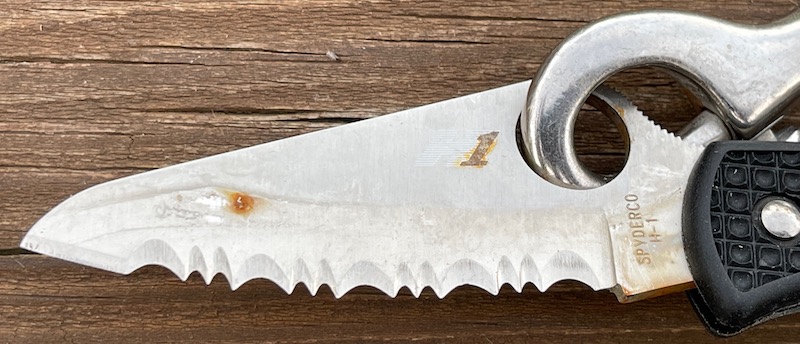 I wish Spyderco would make shears out of H1!Since Spyderco H1-steel knives have been mentioned, I'll post some pics of mine I took with the iPhone this evening. I paid 60 something bucks back on June 8, 2013, for the Spyderco Salt I Serrated Edge H-1 Steel Knife on Amazon. I wanted something pretty rust-proof, because I'd bought 2 regular stainless steel dive knives and a cheap 'titanium-coated' Black Friday special dive knife, and all 3 rusted readily. Judging from my dive log, that knife has accompanied me on somewhere in the neighborhood of 300 dives, some live-aboard (no thorough daily rinse as far as I know) and some Bonaire (I might rinse gear at the end of the day). I don't rinse the knife after a dive, coat it with silicone grease or other protective measures.