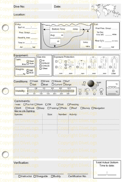 Nice, and they even do custom pages! Anyone ordered a custom book from them?I have used a paper log from DiveLogs.com for many years Scuba dive log refill packs, logbooks, binders, stamps, and accessories Compact, refillable log, easy to archive in binders. Very nice concise section to capture cylinder, weight and exposure protection. I also download my dives from my computer, but do not include this detail.