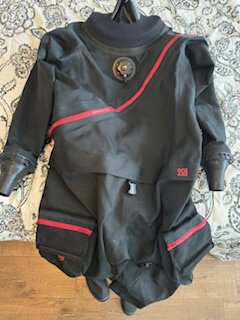 Includes factory installed low profile relief valve and upgraded Sitech replaceable silicone neck and wrist seals. Size 9 boots. Leaked tested and serviced in February in cave country. Suit has less than 25 fresh water dives. Additional pictures on request.