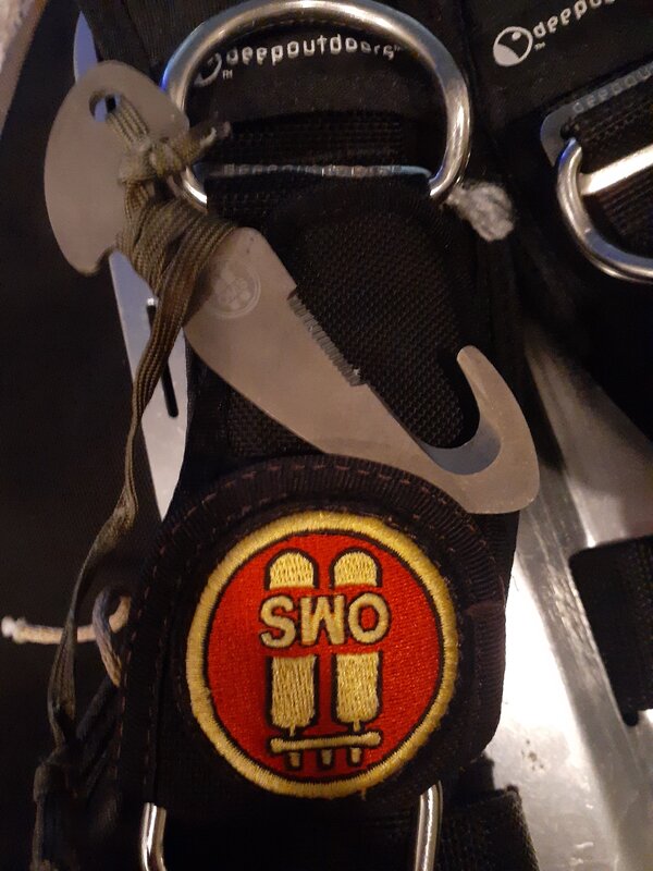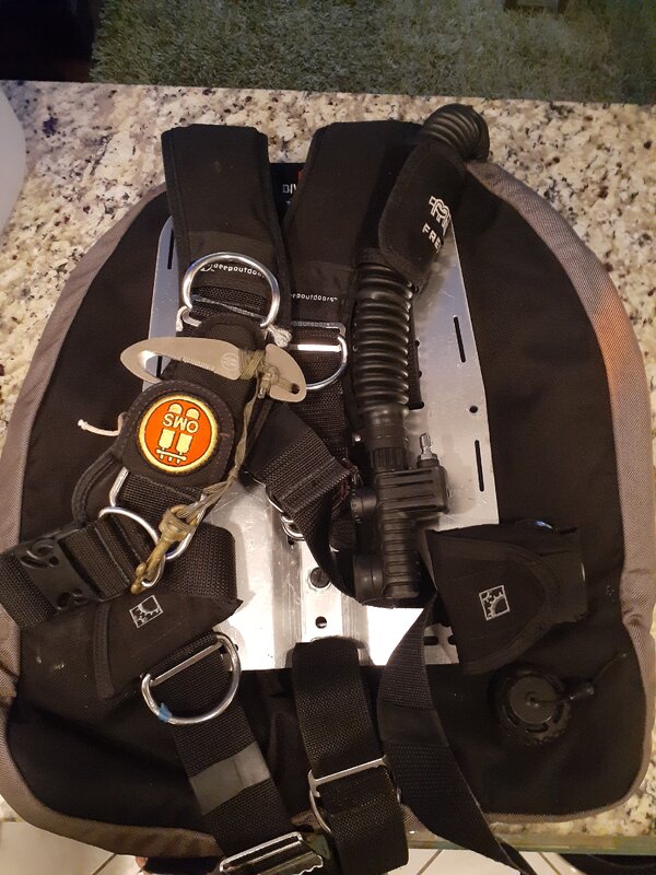 Wing/Back Plate/Harness Set up. With OMS Titanium Line Cutter and Zeagle inflator with garden hose connector.