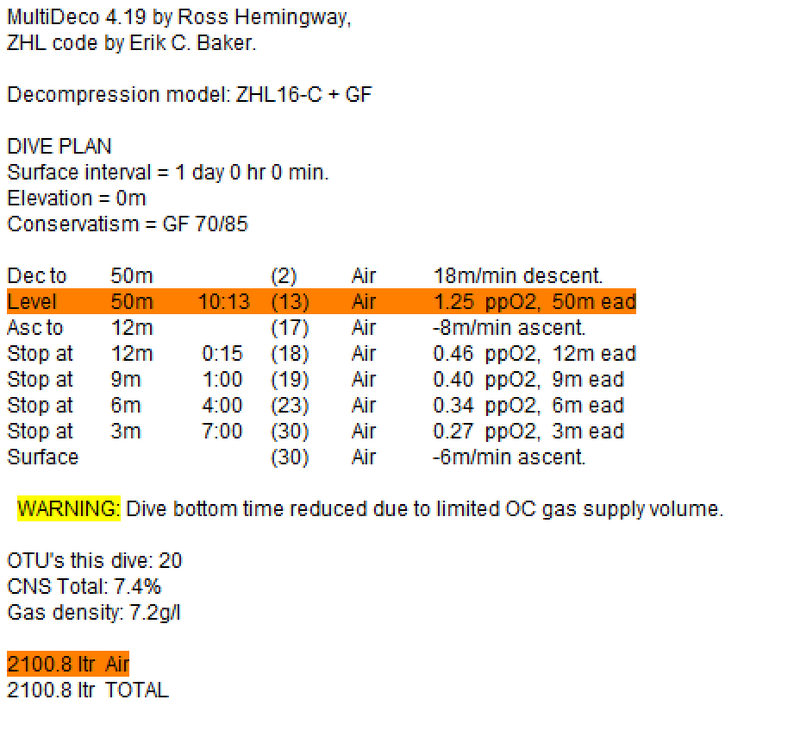 Not sure what your L/min is on this, but I've done that as a single Al80 of air bouce dive down to 60 metres, including a ~200+m transit to get there at ~15 metres (and back), and was easily able to rejoin my 'team' to wrap up a near 60-minute normal dive without running out of gas.