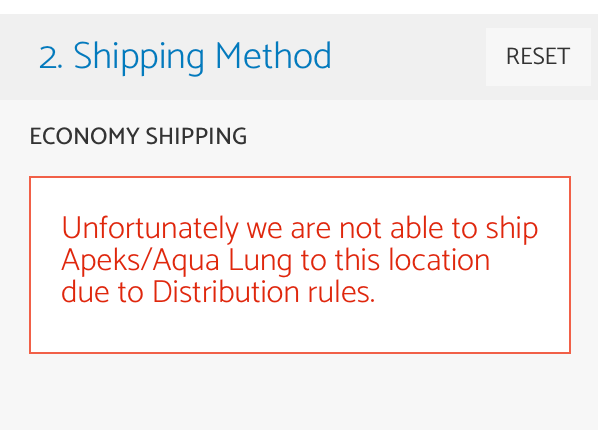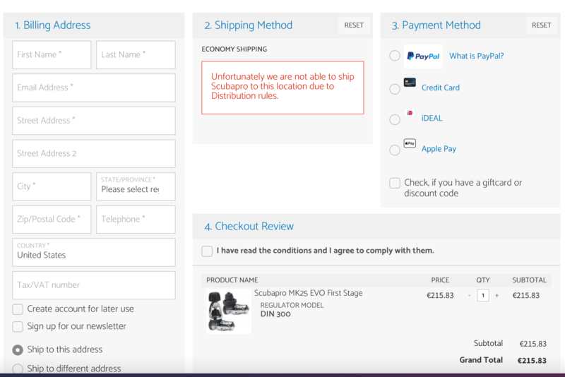 I got the same thing when I added a Scubapro MK19 Evo but when I tried with Poseidon, Mares and Apeks regs, it accepted the order from Canada. So the Poseidon prices especially are lower than direct from manufacturer for sure.