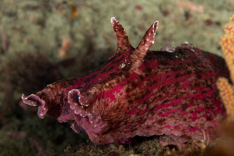 On to the dive. We arrived at Golf Ball Reef using the GPS and fishfinder together for the first time in years. The surface water was green, full of plankton and looked uninviting. We were here and were going diving no matter what. Visibility on the bottom was a pleasant twenty feet. Less than a foot from the anchor chain was a mating pair of Peltodoris mullineri. As I was photographing them, Merry arrived to tell me her drysuit was flooding. She aborted the dive while I stuck it out despite a leaky left sleeve on my suit. Berthella californica were everywhere, as were their large egg ribbons. I found two small Berthella chacei and managed to get one to stick on my stage. Paguristes ulreyi, Furry hermit crabs were piled on many rocks. I found a Berthella californica piled on a Furry Hermit crab. Juvenile Vermilion rockfish, Sebastes miniatus flitted just above the reef while a sea lion buzzed me a couple of times. After I surfaced, Merry and I hung our wet drysuits and headed back to the marina, contemplating more costly drysuit repairs/replacements. Merry suggested selling her camera and giving up diving altogether. She was only half-serious, but we really need a good dive soon.