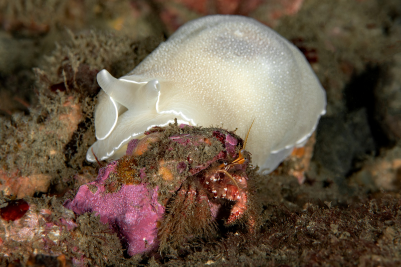 Berthella californica crawling on a Paguristes ulreyi, Furry hermit crab