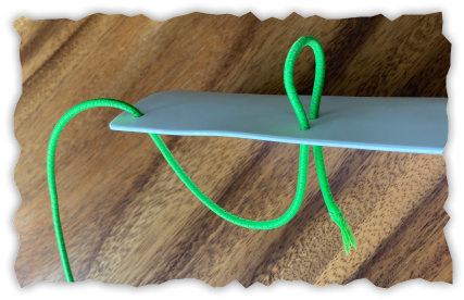 (Piranha supplies some black bungee -- if you source a pencil elsewhere or like other colors, I recommend Paracord Planet (https://www.paracordplanet.com/paracord/shock-elastic-cord/shock-cord/1-8/); they also sell some sizes and colors through Amazon (here or here). For each slate, about 3.5x the long dimension of the slate is right, before knotting and trimming.