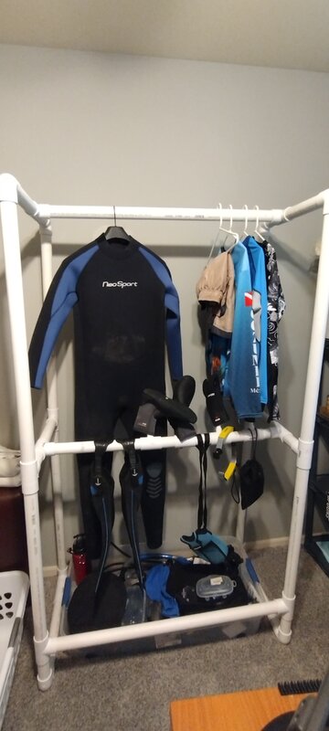 Thank you very much for the suggestions. I look forward to viewing a photo when you get around to it.So, I will give you some suggestions. If you size your PVC correctly you can insert a wooden dowel on the cross pieces, I believe I used 1.25" PVC and 1" dowel. Also, glue the ends onto the cross pieces, you don't want that to separate under load. I also glued the fittings at angle to maintain the angle, mine wanted to slip down and found boots on the ground. I also sized mine to fit on a large dog crate tray, it catches water, then dries naturally. Mine is just wide enough for a wetsuit width and BC lower in front. I will have to take some pictures.