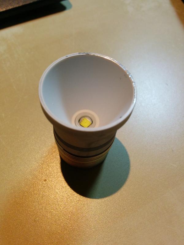 The first is the DX Singfire ($19 with nice alum body and magnetic switch) with holographic diffuser. The second is the $12 yellow DX light with a white painted reflector. The last is both together. Both lights have the same listed light output. The middle one is a Cree XML-T6 at 940 mA on a 18650, the left is the Singfire with a Cree XML-U2 at 1200 mA on a 26650, and the last is both. Both batteries were fully charged to 4.2 V. To get 900 lumens you have to drive the Cree at close to 3000 mA.