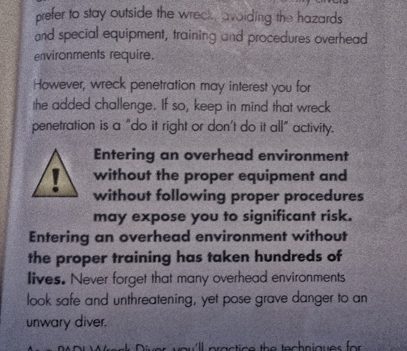 I will repeat what I have said several times in past threads related to the PADI wreck diving course, about which I am highly critical. The main problem can be summed up this way: its wording is extremely poor because of its omissions. After a lengthy discussion about it with PADI headquarters, they admitted the problems. I suggested alternative wording. They said it was excellent and would be used at some time in future revisioins. Here are the key issues with the current wording: