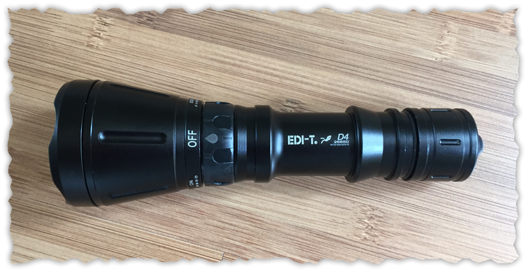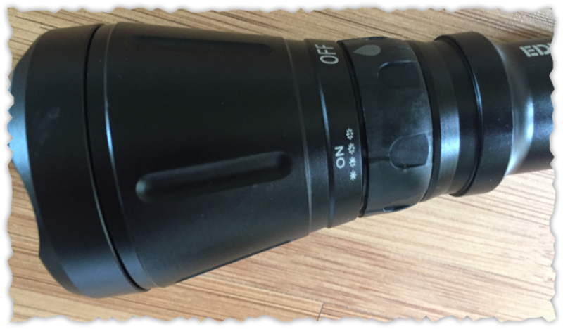 Magnetic switch so it's a fully sealed compartment; rotary, so easy with gloves. Rotate one way for full, 80%, 40%, 20%; the other way for SOS, slow blink, med blink, fast blink.