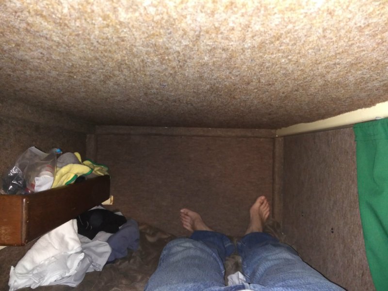 I had the pleasure of occupying the middle of these three bunks. As you can see, only a portion of those bunks are visible. The other 1/3 or so is behind the end double bunks with the escape hatch on top. It butts up against the end bunks at the end of the other passageway, closing up any gap that would be behind the doubles. Here is a photo of the inside of the end bunk. I called it the sweatbox....