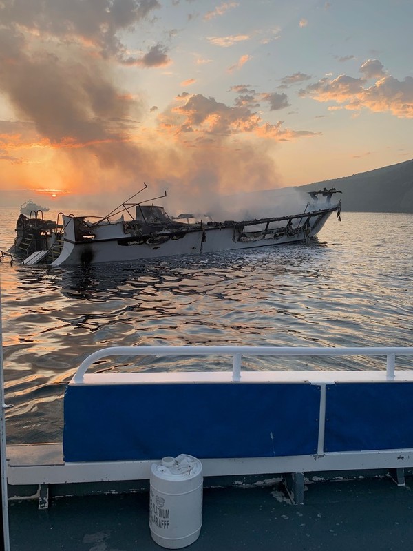 The first few pictures were taken from the Grape Escape sometime after the crew was pulled aboard. The ones I can find prior to someone putting water on the boat show it very badly burned, with the superstructure collapsed and holes in the side. (see below) There are no timestamps on any of these, so I don't know it it was at 3:20 or 3:30am or even later.