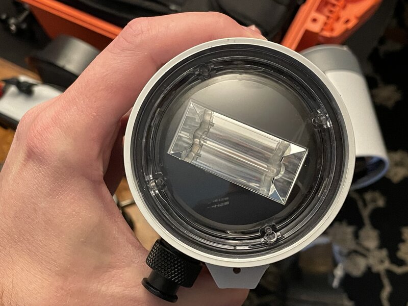 I fired the strobe a few times, then powered it down. After waiting for the voltage on the capacitor to drop to safe levels (measured with a DMM), I then ensured the o-ring was clean, the housing the o-ring slides into was clean, applied some silicone grease, and slid the strobe back into the housing. I needed to put the o-ring into the housing before sliding in the strobe, trying to put the strobe in with the o-ring on the strobe portion caused the o-ring to pop out. While holding it in, I again used a tool to rotate it counterclockwise until it was level with the ball mount on the bottom. I put the bezel and ball mount back in and the reassembly was complete!