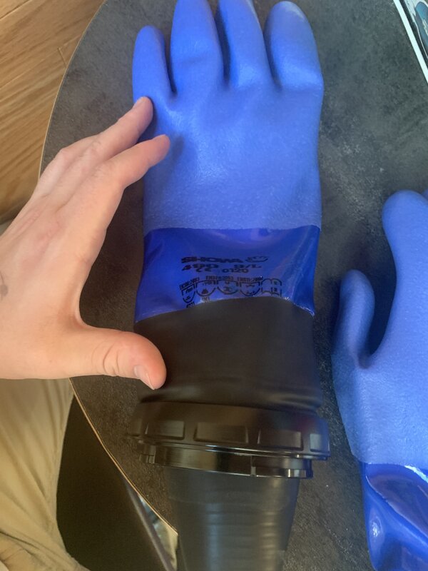 Now everything should be relatively lubed up and you should be able to start working the glove out like this next video. Since you have those latex seals at the end I don't think you are going to be able to pull the glove all the way off like in this vid, so maybe get it started, and then reach inside the glove and see if you can start pushing out one side of the red ring so that it gets a bit of an angle and then the gentle tugging of removing the glove will pull the red ring out as well.
