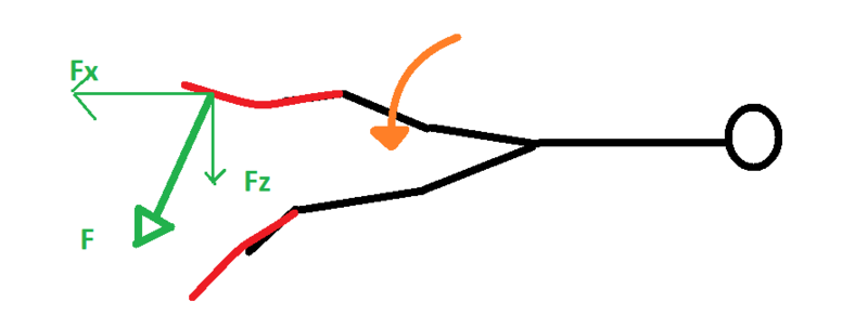 the direction of the force(F) is going to be perpendicular to the angle of the fin....on a typical power stroke only the Fx is contributing to moving you forward, and a large portion of the energy is wasted in Fz which is translated to vertical movement.