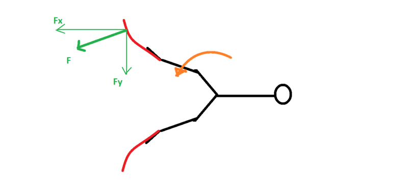 a larger component of the force is going towards Fx (forward momentum)......and the Fy components are not only smaller, but also cancel each other out
