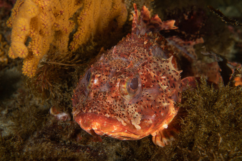 As I headed back toward the anchor I found a California scorpionfish perched on the edge of the reef. I then spotted Merry photographing a two-spot octopus. We spent a lot of pixels between those subjects. As the dive was nearly done, I saw an Apolemia Uvaria floating by. The usual nudibranchs were hiding. I got a bycatch of another Thordisa bimaculata next to a clump of white bacteria. I didn't see it until I got home.