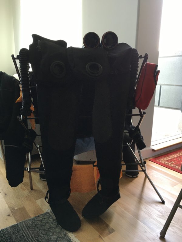 It looks tall, and it's fine for wetsuits, the one hanging down the farthest there is XXL, but my drysuit has a telescoping torso and between that and the feet, it does drag. I fold the legs back and hook them on the crotch strap.
