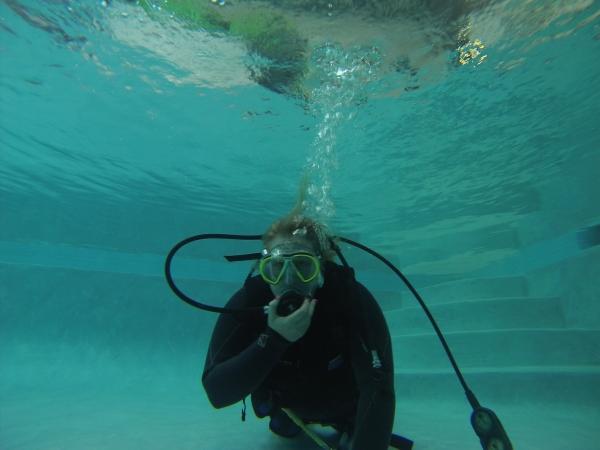 Shes started her OW cert through GCD in mobile (SDI). i hung around for her first class and made myself useful in fetching weights after everyone was in the pool. this is her second time in the pool i joined as well GCD allows students to use the pool at any time for free while they are taking class but shes restricted to the shallow end until she advances further in her training. she did very well with mask flooding and clearing. she also did great at finding a knocked out regulator.i think she was a mermaid in her former life? i didn't adapt as well as she did haha.