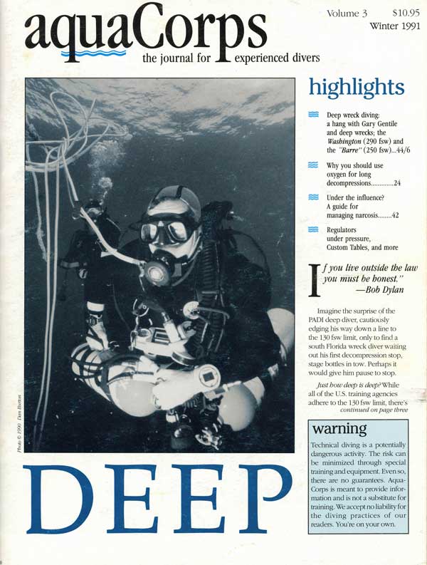 Capt. Billy Deans on (surface supplied o2) deco, Aquacorps Volume 3 (entitled 'Deep') cover, 1991. (And as we know, M2 is still at it, i.e. writing articles for GUE these daze, IIANM.)