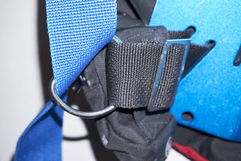 The D-Ring allows the main webbing to move freely through it and it can instantly either be snugged as tight as needed or loosened as much as needed depending on if you are getting into it (loosen it off) or getting ready to dive (pull it nice & snug).