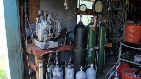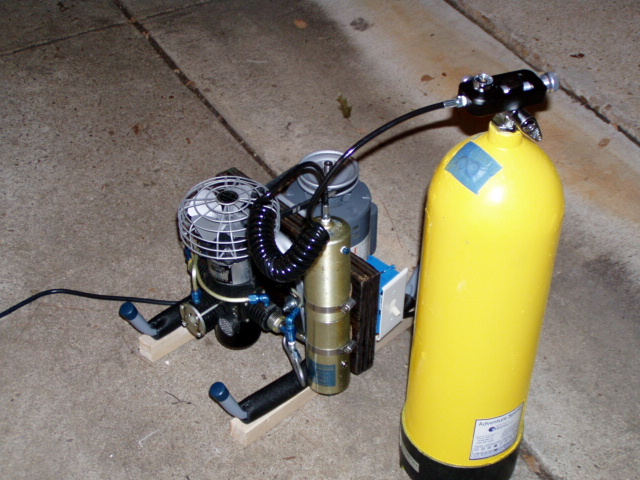 For comparision sakes of what can be done at home: attached is a picture of my "home fill station" at .5 CFM. I made it last year from the original 1957 Popular Mechanics plans for converting surplus Cornelius R300's to scuba compressor. The R300's were used in B27 during WWII and Korea to preload hydraulics. Works! Fill time for my 72CF steel is 2 hours.:cool2: