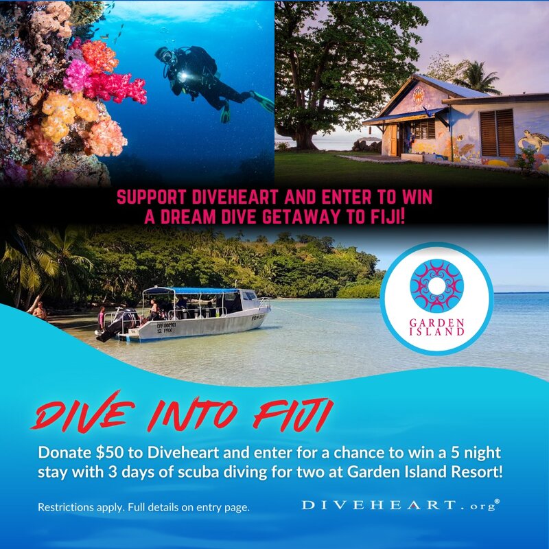 Donate $50 to Diveheart and enter for a chance to win a 5-night stay with 3 days of scuba diving for two at the stunning Garden Island Resort in Fiji!