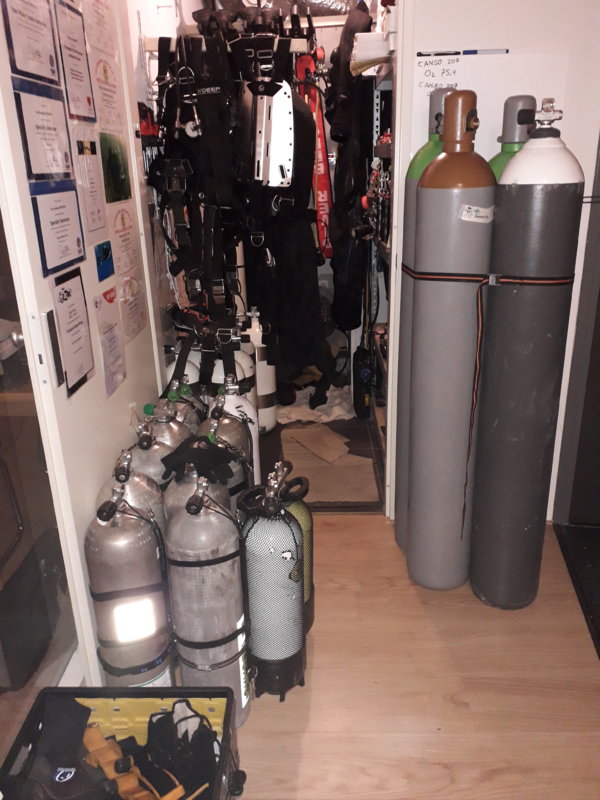 Couple in the front hall, couple in the bathroom (gear rinsing in the tub), couple in the laundry room, couple in the office/dive gear den, the bulk of the out of date and the bulk tanks are lined up in the garage, and one sits in the boat (anchor recovery gear). Avoid storing them in the car, gets too hot here. More than one burst disk has gone due to excess heat around here, but none of mine.