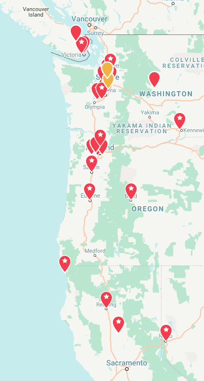 Only one of those dive shops is on the coast, the Crescent City, California one, and it does appear to still be open. Nothing on the Oregon or Washington coast. When I grew up in Oregon, there used to be a four dive shops on the Oregon coast at once. Those dive shops on the map are inland. The ones in Oregon are over the coast range and in the Willamette Valley. If I still lived back home I'd have to drive two to three hours for an air fill now.
