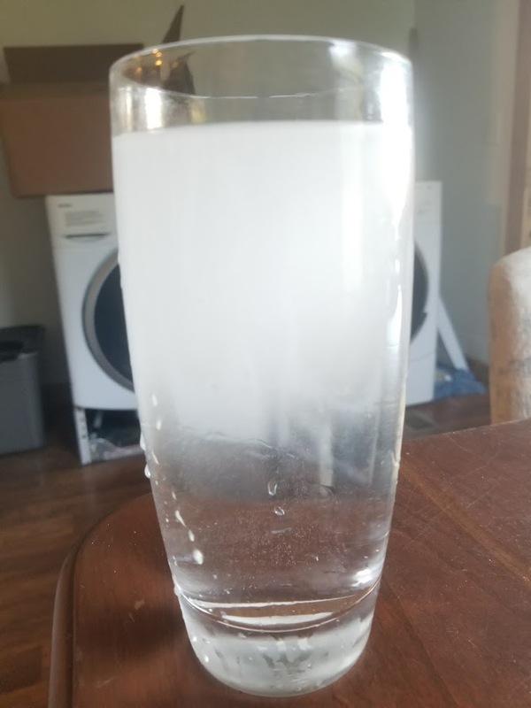 One more thing... my water has the "bends". I don't think I've mentioned this before, but my water comes out quite cloudy and then it clears up. Literally. You see, there is an air pocket in my reservoir tank by the pump. The high pressure my pump puts out allows that air to dissolve into the water. When I draw a glass of water, the bubble form immediately, making it look cloudy as crap. Give it a couple of minutes and it clears right up... from the bottom to the top as the bubbles coalesce and rise. Here's a pic: