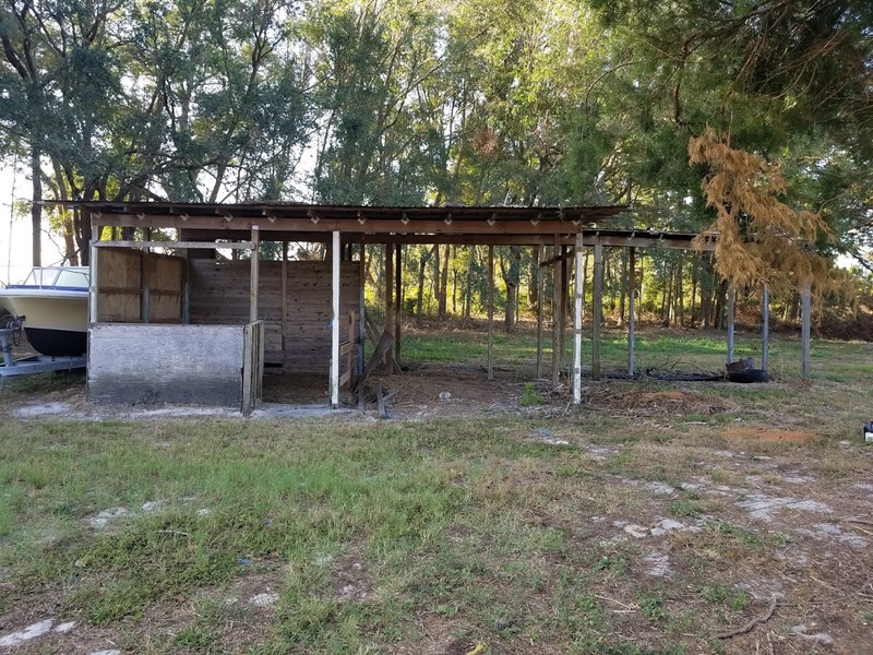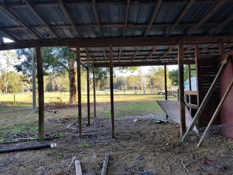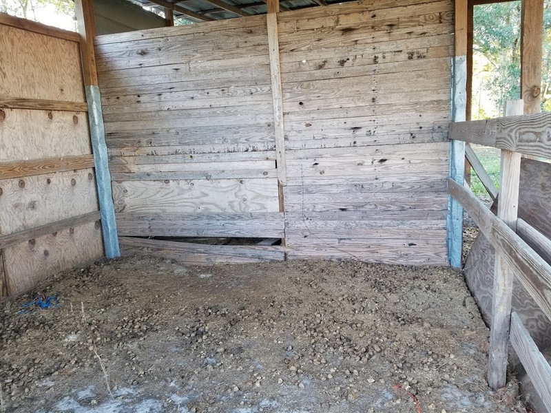 In the interim, my eyes are on the shed/pole barn that sits to the port side of the workshop. They added some 4x4s in odd places where it doesn't look like they needed more support. I think these were used as supports for dividers, so they will come down. I'm going to open up the pen, shovel out the horse manure (volunteers???), put in some plastic shelves (already in the shop), and add a bench to work on the chainsaws and other lawn equipment.