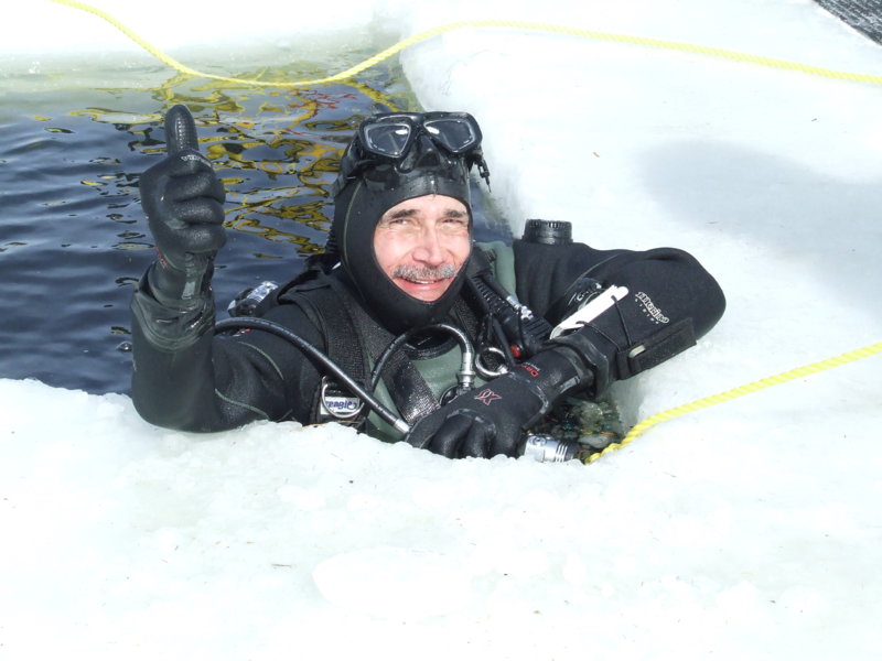 You only need an AOW card to sign up for ice diving. That should tell you something about how safely it can be done. Ice diving is a real, no joke, technical course. You are in an overhead environment that is not to be taken lightly. I’ve previously been under the ice in a grueling PSD course that requires five people just to get onto the ice (at any thickness) to conduct a rescue/recovery op. Ice poisoned me. I was really, really jonesing to get back under solid ice just for fun.