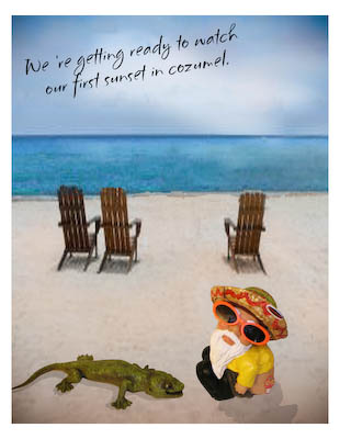 LuLu and I usually do the advanced partying, but I don't know how much gets arranged. We got there 2 weeks ahead of everyone last time and sent interesting postcards like this one to get everyone excited. M & L 1st sunset on the beach_.jpg