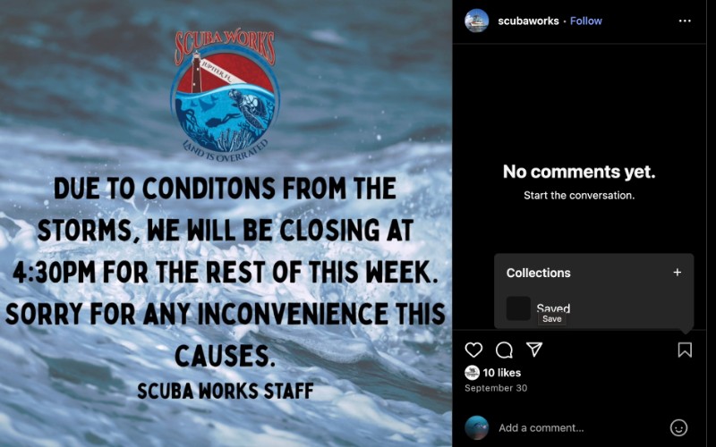 From their IG page it may be temporary due to storms?Rumor has it that Scuba Works changed their locks overnight and are closed for business.