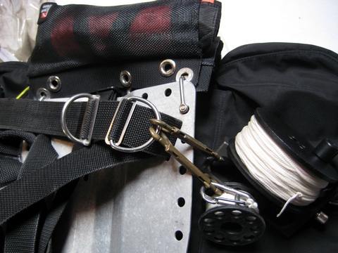 I like to develop muscle memory because it helps in emergencies, so I tend to keep stuff in the same position every time... so the bag always lives under my backplate and my primary reel always lives on harness d-ring.