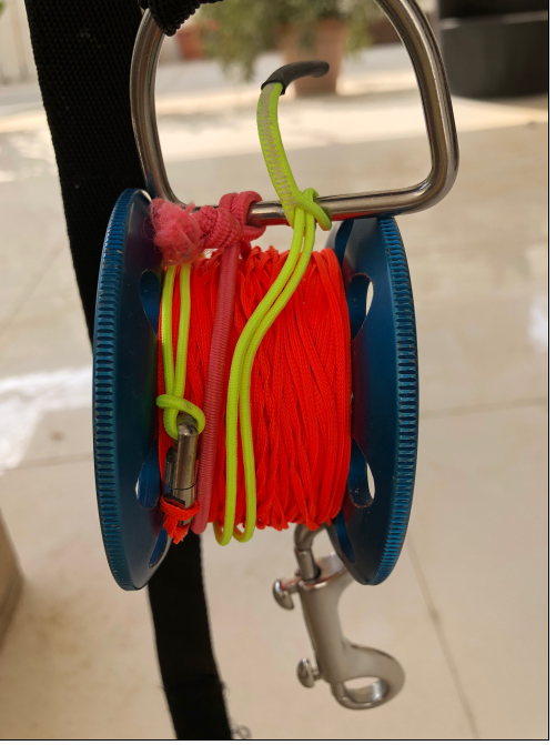 This reel is fitted with 45m line - see how much extra room there is for extra? My other one (of the same size) has 5m of coloured string at the dsmb end so students can easily see the SS mark