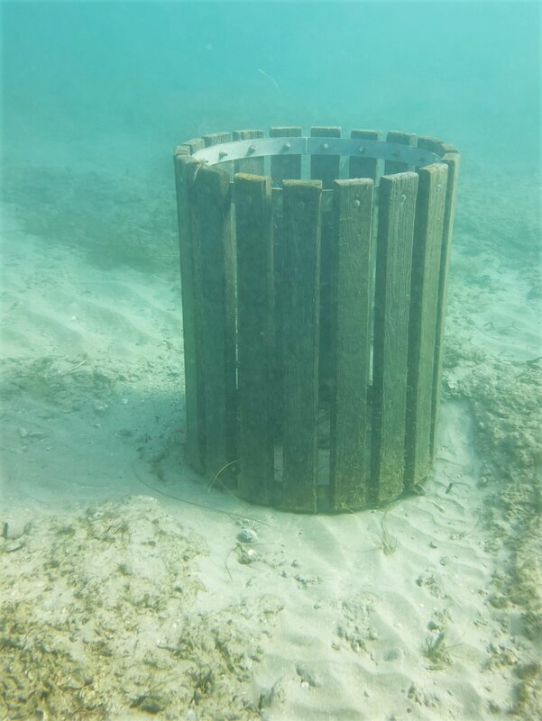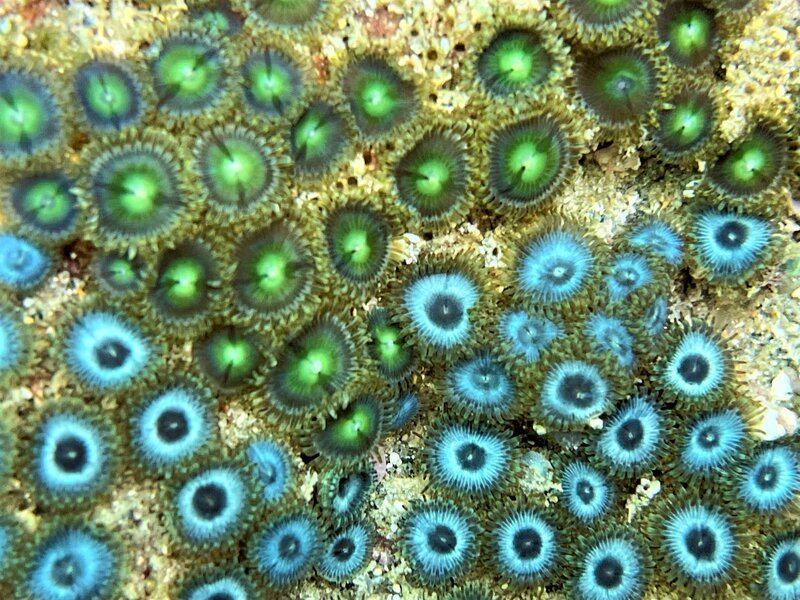 Went to Lauderdale by the Sea for diving today. Arrived at 0745 and parked at Datura Avenue. Sea surface conditions were similar to yesterday, with the swell picking up a little more, and a little more breeze, almost perfect. Visibility was similar to yesterday as well 10-30ft depending on where I was, the further east the better the visibility. Sea temp was 81f, with no current. For those not familiar with LBTS, the reefs run parallel to the shoreline. The first reef starts approximately 130 yards from the beach, approximately half the length of the Anglin Pier. The first reef is about 80 yards wide. At the western edge of the reef the relief is only one foot, with soft corals growing on it at a depth of 17ft. Half way across the relief increases to about four feet with a ledge that meanders and is pock marked with holes about thirty inches across, some people refer to as a swiss cheese reef. The pock marks form lots of smaller ledges. The nurse sharks like to rest under these ledges, it is not unusual to see anywhere from 3-10 nurse sharks here. At the eastern end of the first reef, there is a approximately 100 yard wide sand strip. At the eastern end of the sand strip the second reef starts, and is approximately sixty yards wide. What I just described can easily be seen on google maps. Enter Anglin Pier in the search box, and change to satellite mode. The reef is dark space, the sand is lighter space. Because there was little to no current today I spent time on the first and second reef. Often is the sea state is not calm visibility on the first reef might be less than 10 feet, but visibility on the second reef will be 30 feet. If there has been little wind for a number of days the visibility can be as much as 50-60ft on the first reef, with about the same on the second reef, usually in the summer. You can see this in other trip reports I have done for Lauderdale by the Sea. The collapse of a small section of the western side of the pier has scattered some objects 200 yards to the south at the sand/reef interface of the first reef. Did a few REEF counts today, but have not submitted them, probably about 50-60 species per count. I have included an image of Mat Zoanthids. I believe is the same species with just different colors, looks like of cool to me. I like the next truck I by to have the same color as the blue Mat Zoanthid, I guess it would have to be a custom paint job. Respectively, Surface conditions this morning, Trash Can Holder, Sea Turtle Rescue Sign, Fishing Line Disposal Unit, Atlantic Blue Crab, Porkfish Squadron, Mat Zoanthids, Porkfish video, and Black Margate Video.