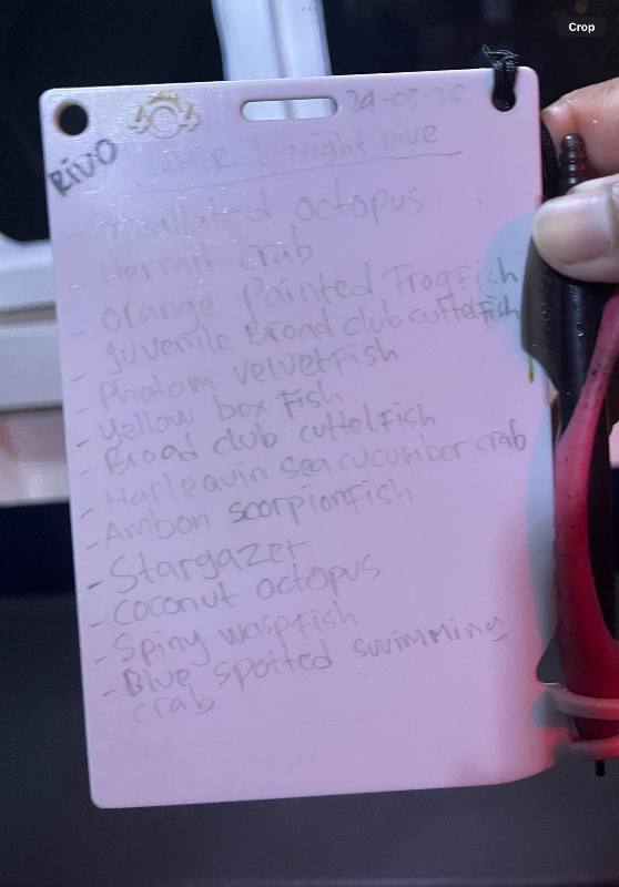 On just the first day here we had three octopus, including mimic and long arm plus a blue ring the next day. I especially like that the guide writes the names down for each critter.