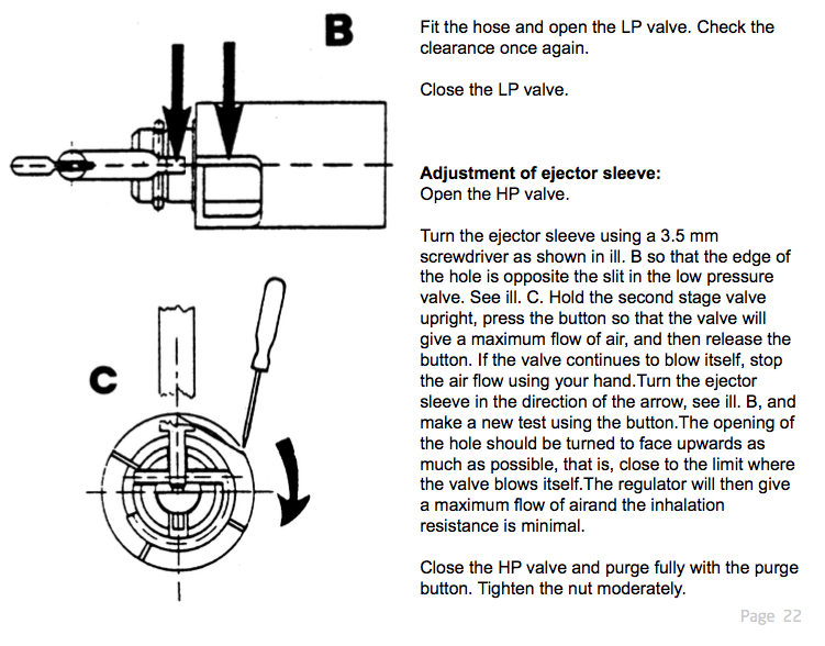 Below, is a section of the manual, where the second stage is adjusted, through the mouthpiece, by rotating an either white or black-colored ejector sleeve. It may just be a matter of decreasing its sensitivity a bit, since the Cyklon is usually set close to a free-flow. I adjust mine in that fashion and futz with it from time to time, if it becomes a bit too touchy.