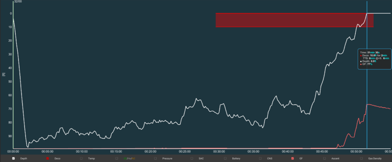 My Perdix is in high conservatism mode, GF 35/75. I did not complete my deco stop at 10 feet. This was the first time I went past NDL.