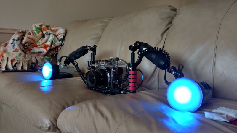 I wasn't completely happy with the color produced by a normal flash as it's more washed out and not quite as "natural" as I'd like. To solve I tested a low, medium, and dark blue plexiglass on an aquarium. My personal preference was for the darker coloration and having two strobes doesn't seem to be lacking on brightness... Will know for sure soon enough.