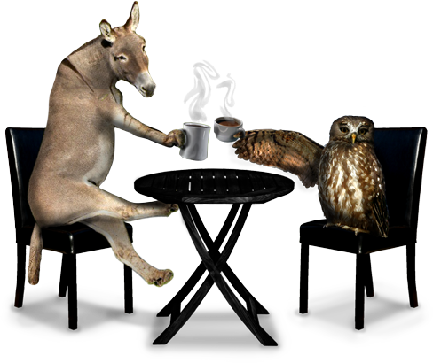 How's about a painting. For you and cvchief, a donkey and a hooter together, having coffee at Michaela's coffee shop: