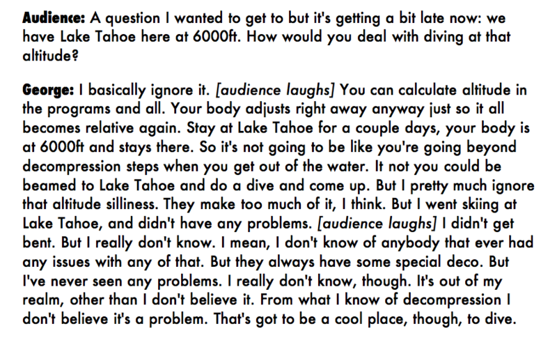 George's statement is actually sad, especially since it led untold numbers of people down that same uninformed path. There are a number of factors involved when diving at altitude. He apparently only knew that one factor and decided it didn't matter. He was probably right about that one factor, but he ignored the ones that are important, I assume because he did not know about them.