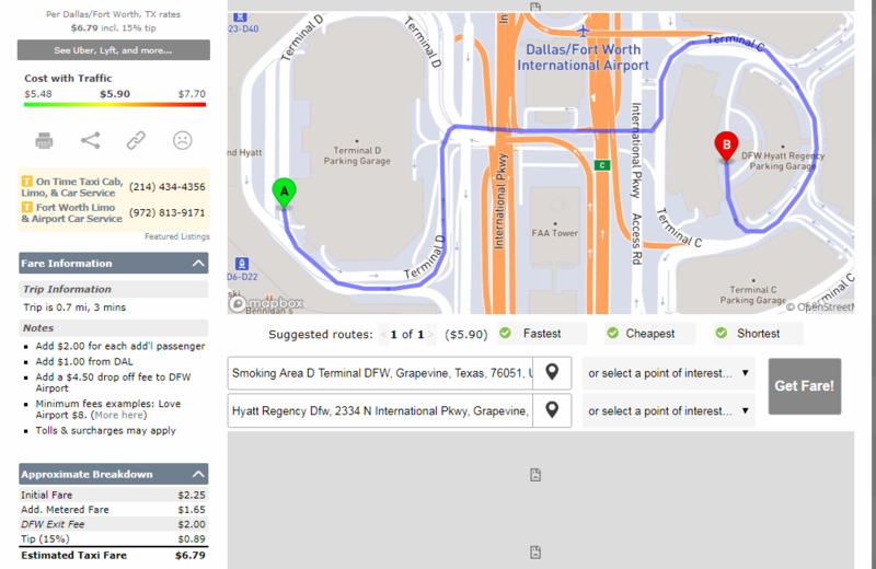 TaxiFareFinder - Dallas Fort Worth International Airport (DFW), 2400 Aviation Dr, Grapevine, Texas 76051, United States to Hyatt Regency Pool, 300 Reunion Bl using Fort Worth, TX taxi rates