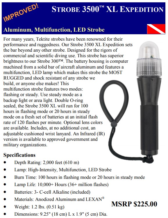 This strobe is the real deal. This is not that goofy plastic version they're selling these days... this is the hard-to-find heavy duty aluminum body version that doubles as a club should you encounter an unwanted creature or hooligan on the way to the dive boat. This thing has the brightest strobe to cut through the thickest murk so you can find the up-line every time. This is brand new, minty fresh and looking for it's new forever home.