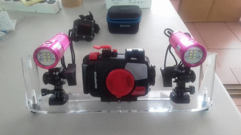 Very nice. I am looking to build my own tray too. Is acrylic positively buoyant?This is my setup. TG6 and PT059 housing. Two Big Blue VL4200P video lights on swivel mounts.