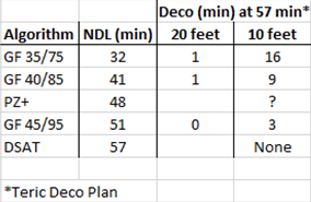 However, this topic has been discussed on numerous previous occasions. All deco stops are not created equal. This is a 1st clean dive on air to 60 ft. NDLs come from my Shearwater Teric running Buhlmann ZH-L16C, and my Oceanic Geo 2, running both DSAT and PZ+. The NDLs vary widely, from 32 to 57 min. If you were to dive GF 35/75, 40/85, 45/95, or PZ+ to the DSAT NDL of 57 min, you would accrue deco time, somewhere between 17 and 3 min