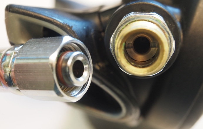 The standard HP (High Pressure) hose connection that was originally designed for SPGs are also used for AI (Air Integrated) dive computer adapters and wireless transmitters for AI wrist-mounted computers. Note the different style "spools" with a separate O-ring for the hose and the mating device.