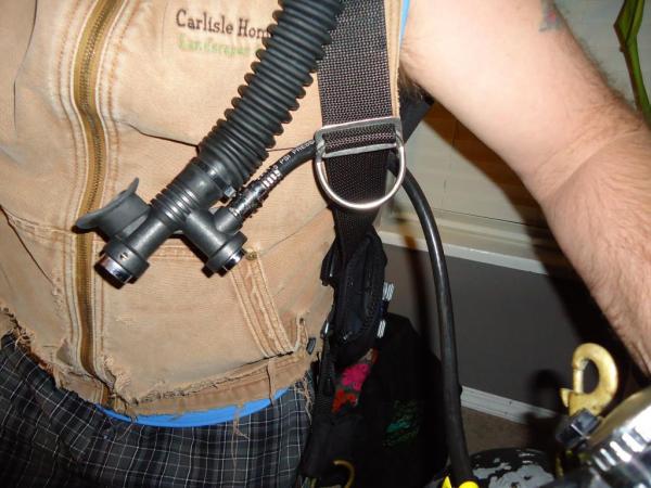 Obviously, dropping your tank lower for the photo does something to disguise the extent of the 180 kink needed in the hose. It'd ride far higher when th tank was bungeed...right? And you've also obviously had to route your LPI hose behind your harness to keep it out of the way... otherwise it rides out and causes that "absolute cluster...." right?? In doing so, your LPI can get trapped behind the harness, making it hard to doff/don the gear for a beginner? And then... we could mention how routing the LPI through the harness would impact your ability to dis-engage the cylinders and move them in front of you with complete flexibility and freedom?